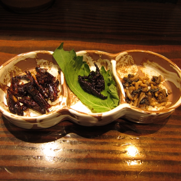 左から、イナゴ佃煮、ザザムシ佃煮、蜂の子です