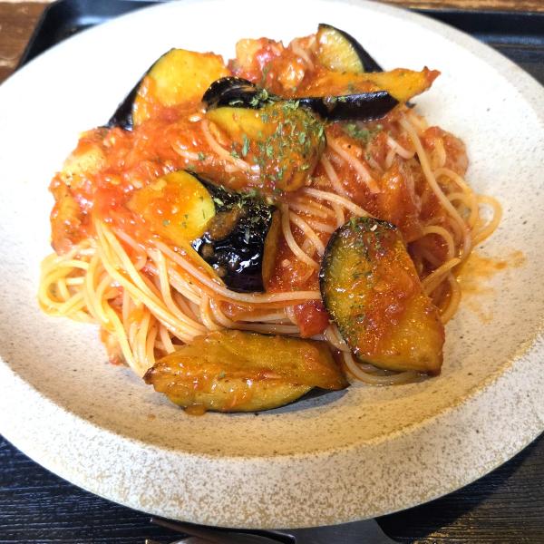 ベーコンと茄子のトマトパスタ